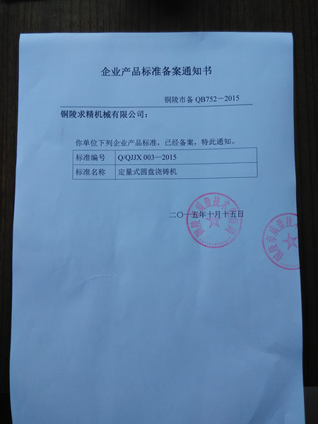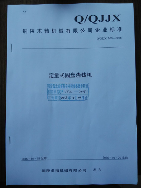 我公司制定的定量式圆盘浇铸机企业标准已审核备案